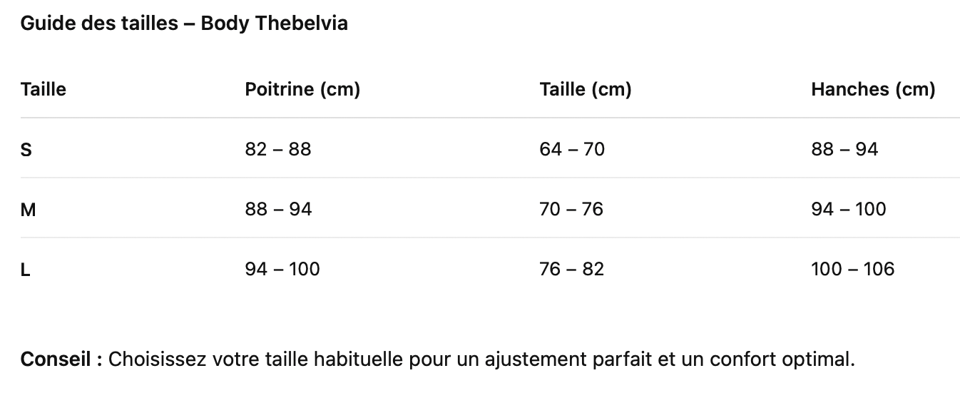 El body Thebelvia está confeccionado con una mezcla de poliéster y elastano, que combina suavidad, transpirabilidad y sujeción . Su malla ligera se adapta a tus curvas sin comprimirlas, para una comodidad óptima y un efecto segunda piel, permaneciendo invisible bajo la ropa.